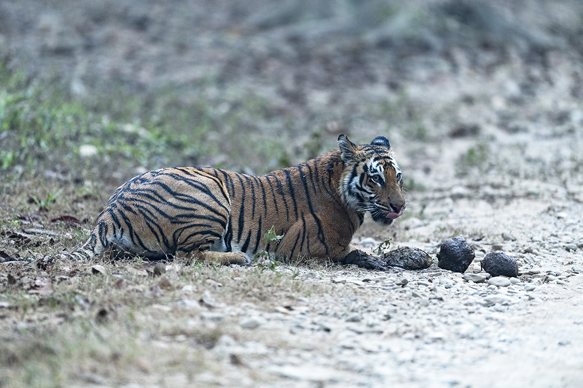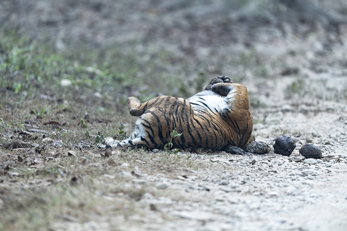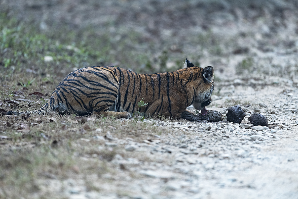 Nature teaches you new lessons every day. Every action in the wild by animals is done with a reason. To learn one has to be alert and also have a good teacher to explain. In the forests of Corbett my teachers are the guides and drivers with whom I travel. This incident happened on a cold winter morning in 2017. I was with Nasir. As usual Nasir and our guide Sohan had predicated the moment of a tiger near the main road and we had taken up a good position to photograph the tigress when it would emerges into the open. The tigress came out as expected and also from the exact spot where Nasir had said it would come out and then we saw a strange thing happen. On the road there was a pile of elephant dung and the tigress rushed to it.