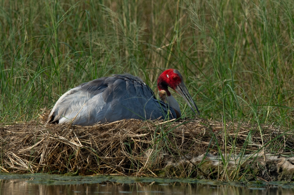 The Sarus builds its nest in a field or in water bodies and lays at most 2 eggs that takes around 30 days to hatch. the gap between the hatching of the eggs is 24 hours.