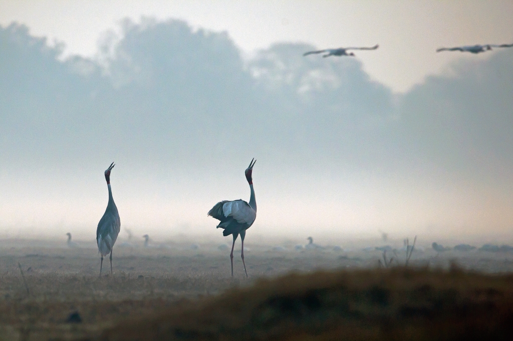 A pair of Sarus trumpeting to let another pair overflying their Territory know that this place is taken